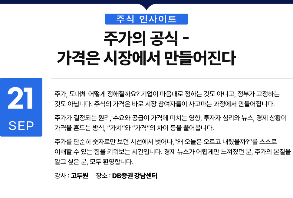 주가를 단순히 숫자로만 보던 시선에서 벗어나,“왜 오늘은 오르고 내렸을까?”를 스스로 이해할 수 있는 힘을 키워보는 시간입니다. 경제 뉴스가 어렵게만 느껴졌던 분, 주가의 본질을 알고 싶은 분, 모두 환영합니다.